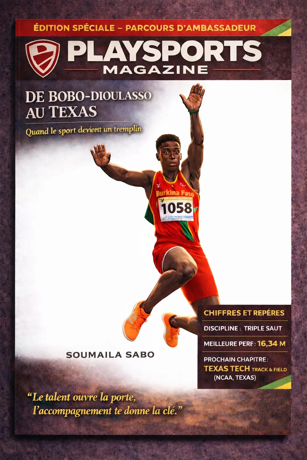 Ce jeune athlète, à la fois humble et déterminé, incarne parfaitement les valeurs de PlaySports : ambition, dépassement de soi, et inspiration pour la jeunesse burkinabè.